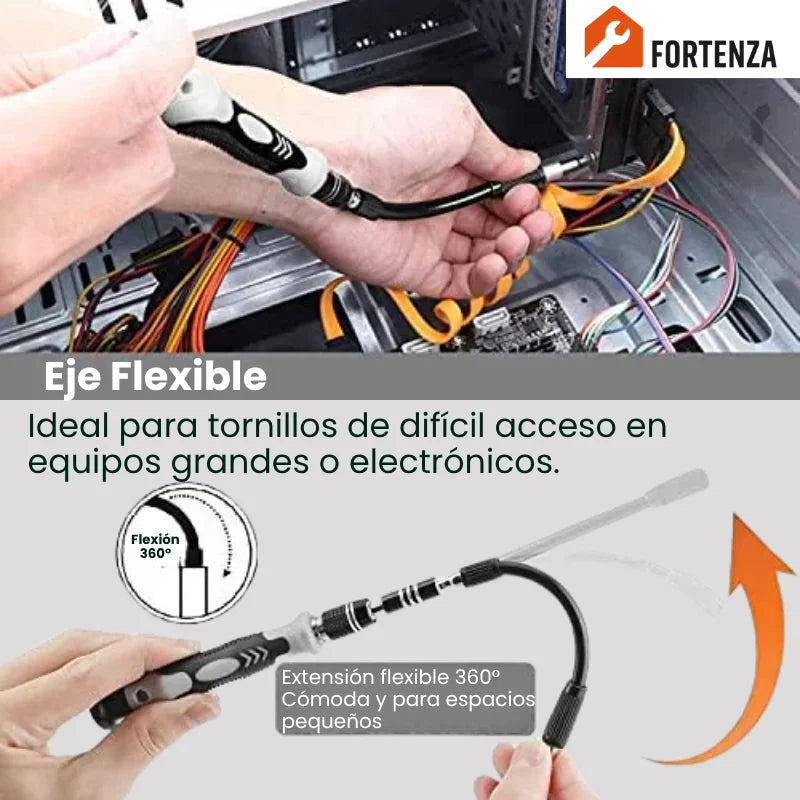 El mango ergonómico es universal para todas las puntas del kit, incluyendo la extensión flexible y el adaptador angular.