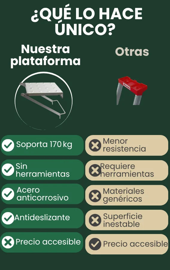 La plataforma soporta hasta 170 kg (375 lbs), siempre y cuando esté correctamente instalada y se use en condiciones estables.